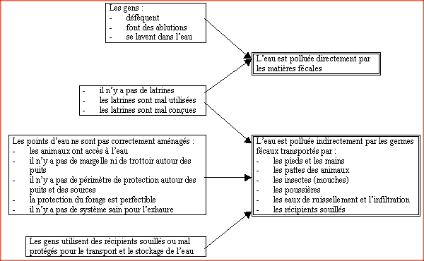 L'enquête sanitaire offre une approche plus globale, donc plus significative de la situation. Elle permet de révéler la vulnérabilité de l'eau par rapport à la pollution et garde toute sa valeur dans le temps. Dans la plupart des cas, une enquête de terrain peut, à elle seule, donner une idée assez juste de la qualité bactériologique de l'eau et de sa vulnérabilité vis-à-vis de la pollution. Il s'agit de faire le bilan de toutes les situations qui permettent aux excréta d'être en contact avec l'eau que cela soit de façon directe comme la défécation dans l'eau, ou indirecte (cas des eaux de ruissellement). Ce bilan doit être mené sur toute la filière de l'eau, depuis le point d'eau jusque chez les consommateurs. Le risque doit être évalué en prenant en compte les facteurs situés dans la colonne de gauche du schéma ci-dessous :