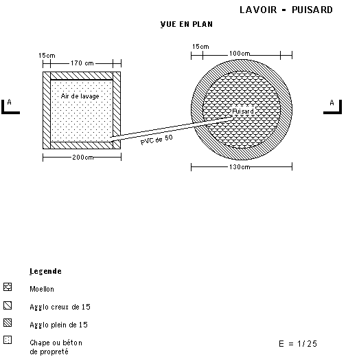 Le lavoir-puisard est composé d'un lavoir et d'un puisard reliés par une conduite en pvc de 50 1. Le lavoir C'est une aire aménagée, construite sur un léger décapage de 10 cm sur une surface de 2,2 m x 2,2 m. Elle est délimitée par un muret carré de 2 m de côté; ce muret est fait d'une couche de maçonnerie en parpaings creux de 15 rembourrés sur place au mortier de ciment ou en parpaings pleins de 15. Construit sur un béton de propreté de 5 cm, il est crépi sur les deux faces avec du mortier de ciment dosé à 300 kg/m3. Un dallage lissé à la barbotine de 5 cm d'épaisseur est exécuté à l'intérieur du muret. Ce dallage est incliné vers un coin d'où part le tuyau d'évacuation. 2. Le puisard C'est une fosse circulaire de diamètre 1 m et de profondeur 2 à 3 m selon la quantité d'eaux usées produites. Elle reçoit et permet l'infiltration des eaux usées dans le sol. Elle est selon la nature du terrain remplie de moellons latéritiques ou non. Les moellons retiennent les matières grasses et empêchent l'éboulement de la fosse. Deux dalles semi circulaires de diamètre 1,30 m couvrent la fosse. Ces dalles reposent sur un soubassement en maçonnerie de parpaings de 15 rembourrés de mortier, construit tout autour de la fosse et crépi sur la face intérieure. 3. Le tuyau d'évacuation Un tuyau d'évacuation en pvc (diamètre 60 mm) relie le lavoir au puisard. Il conduit les eaux usées vers le puisard dans lequel il pénètre d'au moins 10 cm, afin d'éviter l'écoulement des eaux le long de la paroi de la fosse.