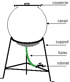 Le support C'est un trépied en fer tor de 12. Il stabilise le canari en le surélevant d'environ 90 cm au dessus du sol. Il est constitué de 3 fers verticaux fixés en triangle équilatéral, reliés à mi-distance par 3 barres et au dessus par un cerceau sur lequel est disposé le canari. Sur une de ces barres horizontales, est soudé le manchon. Le robinet de puisage Il est fixé sur un manchon soudé à l'une des barres horizontales du support. Le robinet sert à prélever l'eau du canari à l'aide d'un tuyau flexible qui le relie à l'embout en mortier de ciment. Le raccord Tube flexible de Ø 32, il relie l'embout en mortier de ciment (à la base du canari) et le manchon du robinet.