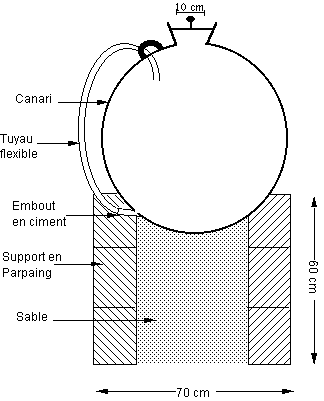 II) Mise en œuvre du Poste d'Eau Potable - Disposer d'un canari ordinaire sphérique de 80l environ. - Confectionner un embout, de 10cm de long, en mortier de ciment (dosé à 450 kg/m3), de 3cm de diamètre extérieur et 1cm de diamètre extérieur. L'embout doit sécher pendant environ 48h. - Le canari étant en position renversée, percer lentement et délicatement sa base d'un trou ciculaire de 3cm de diamètre à l'aide d'un couteau. - Par le trou percé, faire pénétrer de 2cm environ l'embout dans le canari et boucher les joints avec du mortier de ciment à l'intérieur et à l'extérieur du canari. Laisser sécher l'ensemble pendant 48h en protégeant l'embout et les joints par une toile inbibée d'eau. - A l'aide du fer tor de 10, façonner un cerceau de diamètre équivalent au diamètre de la base du canari. - Le cerceau étant disposé horizontalement, souder verticalement sur ses bords, trois barres de fer de 10 de 1m de hauteur. Ces barres disposées équitablement sur le cerceau doivent être légèrement obliques. Pour assurer l'équilibre du support, trois autres barres seront soudées horizontalement barres verticales et à mi hauteur de ces dernières. - Sur l'une des trois barres horizontales, est soudée un manchon qui recevra le robinet de puisage. - Poser le canari équipé de son embout sur le cerceau. - Relier l'embout et le robinet à l'aide d'un tuble flexible en ajoutant si besoin les pièces de plomberie adaptées.