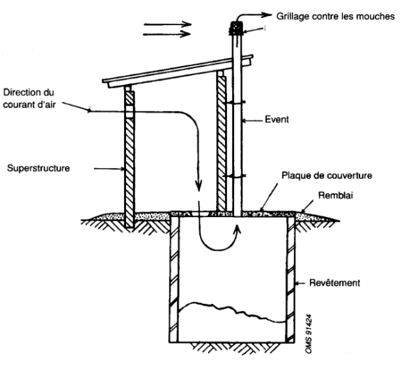 Le trou de défécation doit rester ouvert pour permettre le libre passage de l'air. L'évent doit déboucher à au moins 50 cm au dessus du toit, sauf si celui-ci est conique, auquel cas le tuyau doit arriver à la hauteur du sommet. Des turbulences de l'air dues aux bâtiments environnants, ou d'autres obstructions (arbres), peuvent provoquer une inversion du courant d'air, d'où une mauvaise odeur dans la cabine. Si la vitesse du vent est d'environ 2 m/s, ce qui est relativement courant à la campagne, la vitesse de l'air dans l'évent sera d'environ 1 m/s. Ce courant d'air peut aussi se manifester à des vitesses de vent plus faibles, car le rayonnement solaire chauffe l'air de l'évent et provoque son mouvement ascendant. Dans ce cas, l'évent doit être placé du côté équatorial de la superstructure. Afin d'augmenter l'absorption de chaleur, on peut le peindre en noir ou mieux le fabriquer dans une matière noire. Cependant, lorsque l'on compte sur le rayonnement solaire pour assurer la ventilation, de mauvaises odeurs peuvent survenir dans la cabine à certaines heures du jour (en général au petit matin). Cela est dû au fait que l’air extérieur est plus froid que celui qui circule dans l’évent, ce qui peut bloquer la circulation. La seule solution est de boucher le trou de défécation à la tombée de la nuit. Le grillage situé au sommet de l’évent est essentiel car il constitue un bon piège contre les mouches. Quelques mouches peuvent néanmoins arriver à pénétrer dans la cabine et entrer dans la fosse par le trou de défécation. Cependant, si elles pondent dans la fosse, les mouches essaieront de quitter la fosse en volant vers la lumière. Si la cabine est suffisamment sombre, la source principale de lumière se trouve au sommet de l’évent, dont le grillage empêche les mouches de sortir. Elles retombent finalement dans la fosse où elles meurent. L’exploitation normale se réduit à tenir la cabine propre, à veiller à ce que la porte reste bien fermée, à vérifier , à l’occasion, que le grillage anti-mouche de l’évent n’est ni obstrué ni déchiré et à verser une fois par an de l’eau dans l’évent pour éliminer les toiles d’araignée.